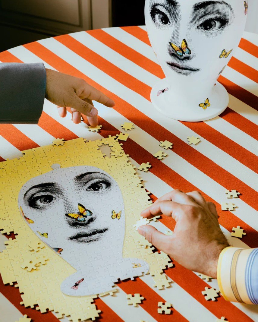 Fornasetti is a tireless observer, a transformer of reality, an entomologist of fantasy. His refined artwork is rooted in inspiration from the natural world, which he reinterprets from memory by combining grace and irony. Butterflies have populated Fornasetti’s work since his first printing experiments in the 1940s. The black line outlines life-size butterflies and the skilled hands of the Atelier's painters still produce them today, following the original colour patterns and shaping sophisticated furniture, accessories and porcelain.