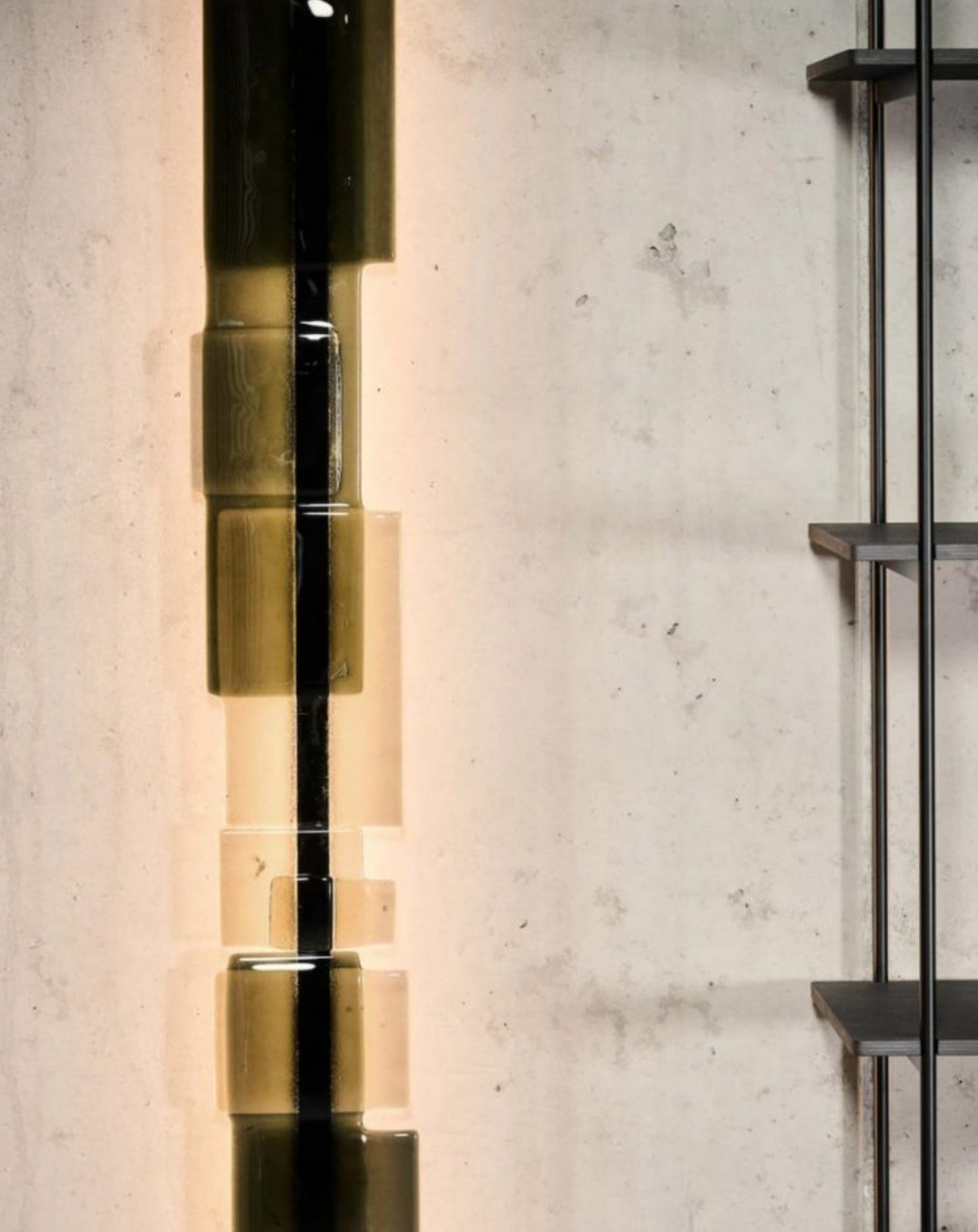 Overlapping sheets of glass are heated until they fuse together and ultimately form the shade for this collection of wall sconces - Fundo light. The different hues and opacities of the sheets are composed into a pattern resembling a complex patchwork.